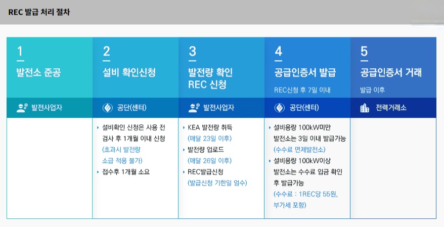 A사용전검사 완료 후, 1개월 이내에 설비확인 신청이 완료되면 상업운전개시일로부터 공급된 전력량에 대해 REC가 발급됩니다.