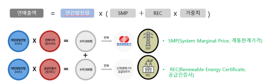 따라서 신재생에너지 발전사업자가 REC로 얻는 수입은 REC 단가에 가중치를 곱한 금액을 얻게 됩니다.